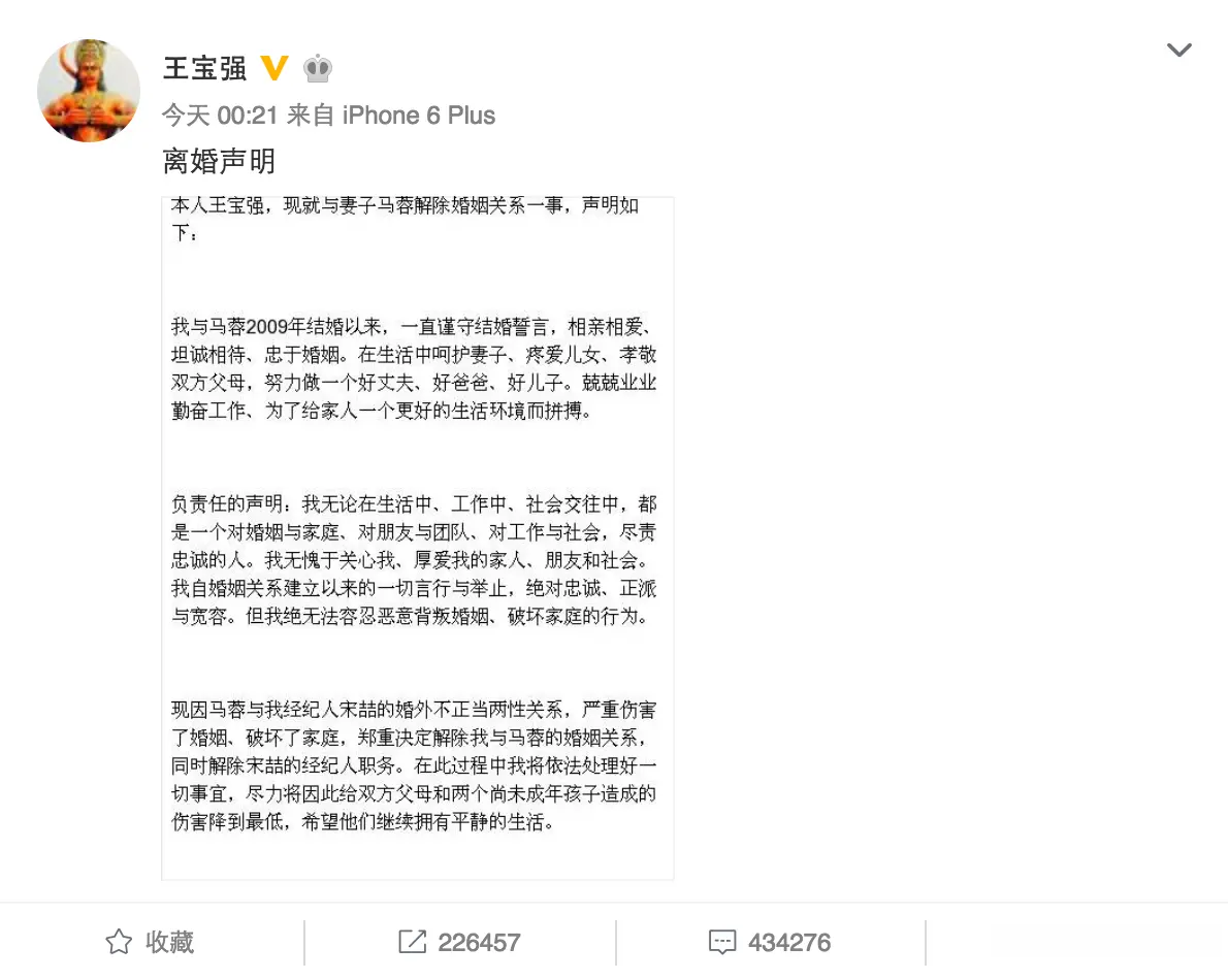 很多人记得2016年8月王宝强在微博发出的那条离婚声明。